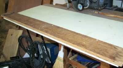Encima de la madera contrachapada pintada es un pedazo de madera contrachapada de 3/4 de pulgada de cuatro pies de largo y aproximadamente seis pulgadas de ancho. Fue cortado desde el extremo de una hoja de madera contrachapada de 4 x 8 pies de tamaño. El borde frente a la cámara es la fábrica de cortar el borde, que es muy recta y verdadera. Después de cortarlo de una nueva hoja de madera contrachapada de hace muchos años, puse la máquina de cortar el borde contra una valla y adornado con un rip cortar de manera que ambos bordes son totalmente paralelas. He guardado esta pieza como un accesorio importante en mi taller desde hace muchos años. Lo uso a menudo como guía para mi sierra circular. Aquí voy a mostrar en uso como una guía para el centrado el borde ondulado de la madera contrachapada de 1/4 de pulgada.