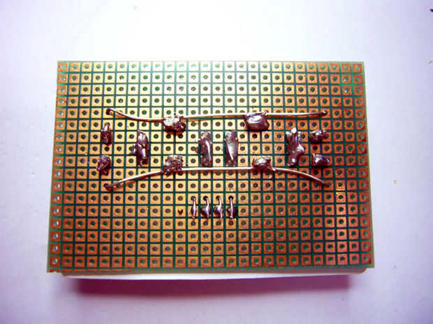 Gire sobre placa de prototipos. Inserte los cables pelados como se indica (consulte el diagrama impreso en otro lado a lo largo). Cables en hilo y luego otra vez a como cerrar como sea posible al terminal y sostenga en su lugar como se muestra. Soldar dos norte y dos sur nodos de los rectificadores para la bobina 1 y 2 para los cables abiertos funcionamiento de terminal a terminal. Esto se une a los rectificadores a los terminales para completar el circuito del motor paso a paso (generador). Asegúrese de que los cables abiertos lejos de las otras conexiones.