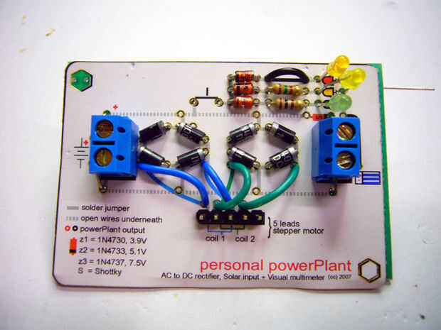 Insertar los diodos de zener en la dirección correcta como se muestra en el diagrama del circuito impreso y según la clave como se muestra en la parte inferior. Los números de la clave se corresponden con los números impresos en los diodos de zener. Introducir las resistencias en las ranuras con los colores correspondientes (en este caso que la dirección no importa). Corte una pieza de alambre negro y tira de ambos extremos, inserte al lado de resistencias como se muestra. A continuación inserte los tres LEDs en orden como se muestra: verde, amarillo, rojo (naranja).