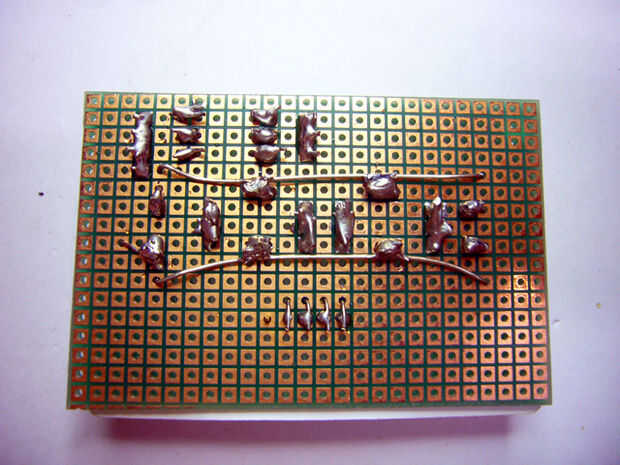 Voltee la placa de prototipado y soldadura el multímetro visual en su lugar como se indica. Consulte el diagrama impreso en el reverso. Cruzar los cables para mantener en su lugar y facilidad de soldadura. Evitar conexiones frío (mate en apariencia). Asegúrese de mantener conexiones separadas que no deben ser, como esta zona está bien organizada.