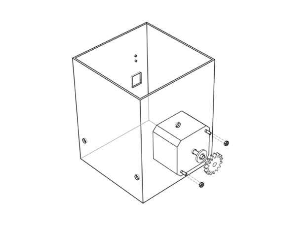 Inserte motor paso a paso en caja como se muestra con los tornillos del motor hacia fuera de la caja. Fije los tornillos a caso con 2 tornillos #4 máquina. Coloque una arandela #10 en el eje del motor que sale de la caja y luego coloque el engranaje pequeño (opcional) en la parte superior como se indica.