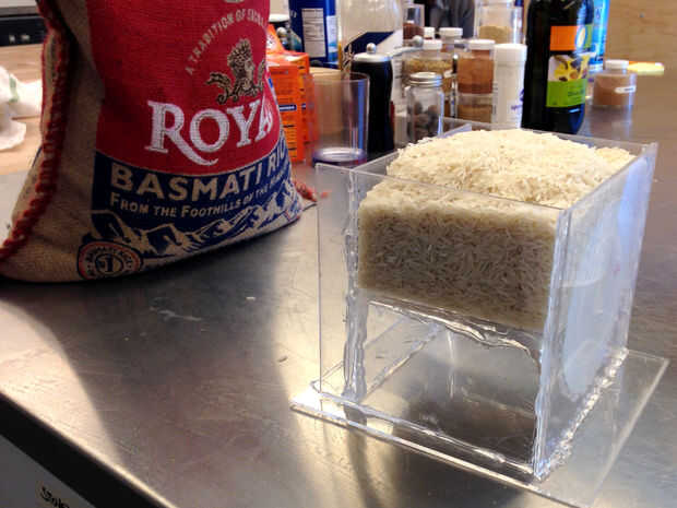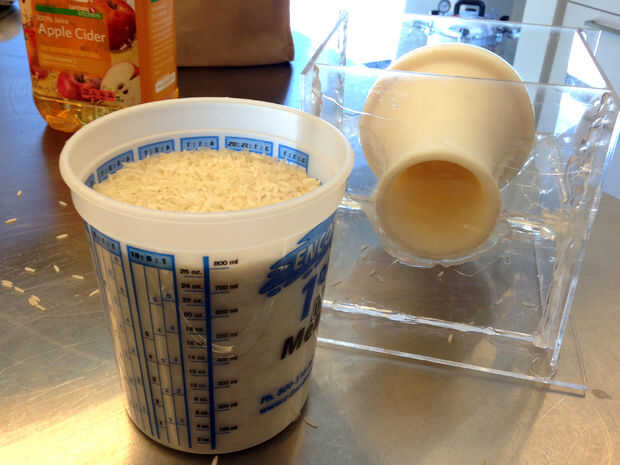 Antes de empezar a conjeturar cuánto volumen necesita utilizar para llenar el lado abierto del molde es una buena idea para medir el volumen. Un método fácil y buena que te recomiendo es usando el arroz. Vierte como mucho arroz necesario llenar el lado abierto y luego utilizar un dispositivo de medición y tomar nota de cómo mucho estaba usado (800 ml).