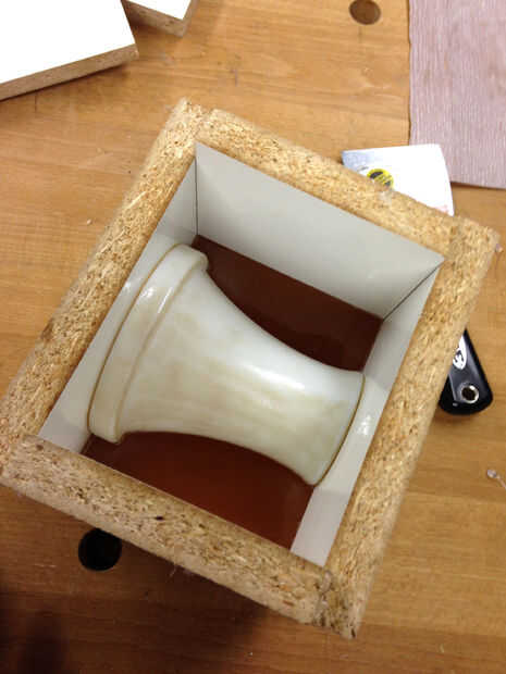 Ahora es el momento para hacer la otra mitad de tu molde 1. Para esto usted necesita hacer una caja de melamina con las mismas dimensiones para el molde a y 3d modelo impreso Acomódesela.