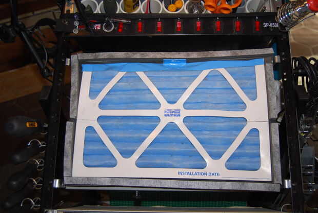 Tomé un filtro del horno y cortar por la mitad para cubrir completamente el área del ventilador. Había pegado el borde cortado uno, añadió una lengüeta y había pegado de 1/2 "x 1/2" tiras de aislamiento de espuma alrededor del filtro. Usé pegamento RTV para la capa inferior puesto que se no pegan lo suficientemente bien como para el conjunto del ventilador. He construido capas hasta que ya era lo suficientemente alto como para que el panel superior se presiona contra él, no asegurar ninguna salida del polvo. Si mira con atención, verás que he dejado un pequeño espacio sobre los lados izquierdo y derecho para la parte de los paneles de malla que se pegan abajo.