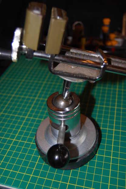 Tomé un viejo altavoz imán, perforado y roscado un agujero en la parte superior y montado en una prensa de tornillo en él. La parte difícil no es conseguir limaduras de metal pegados al imán cuando haces esto. Puse el imán en una bolsa de sándwich y poner cinta adhesiva sobre la zona que quería hacer. Perforado y golpeado ligeramente a través de la cinta, que se corte limpiamente y no Envuelva alrededor de la broca. Todas las fichas estaban en el exterior de la bolsa. Yo con cinta sobre el agujero y el revés del bolso, atrapar todas las partículas en el interior.