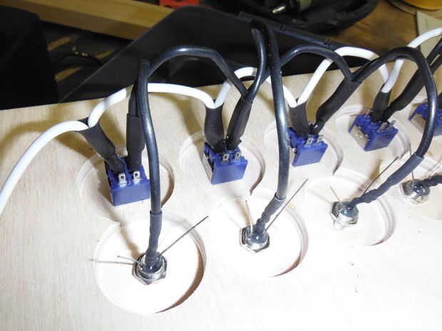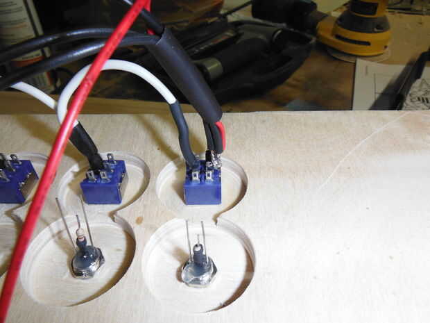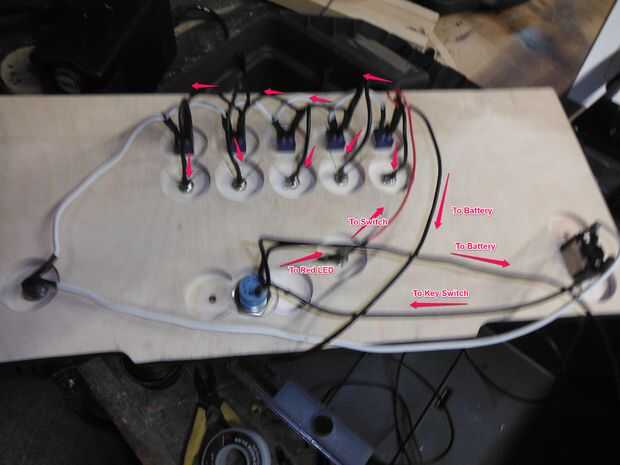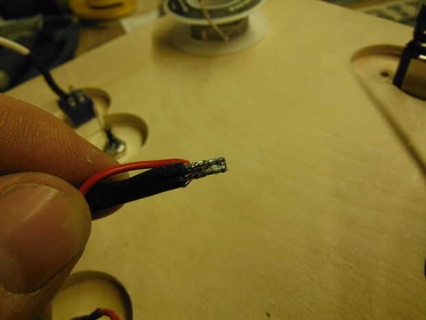 también es el cable del LED rojo y el cable final va a la derecha del LED rojo/verde situado directamente al lado del interruptor. De todos los cables y el interruptor de prender y luego soldar los cables entre sí y luego soldar el paquete grande de cables con el conector de la lata.