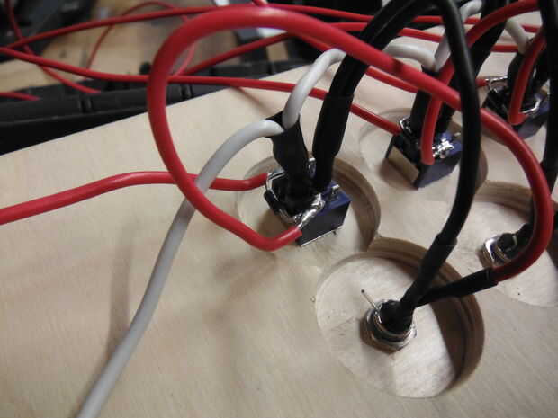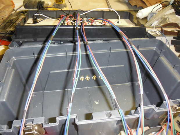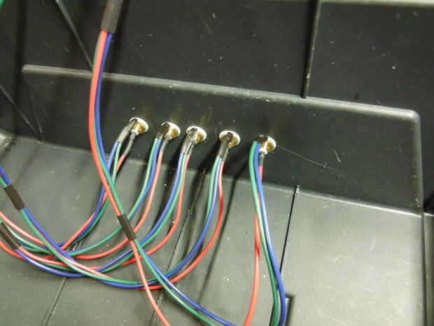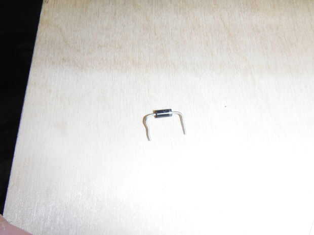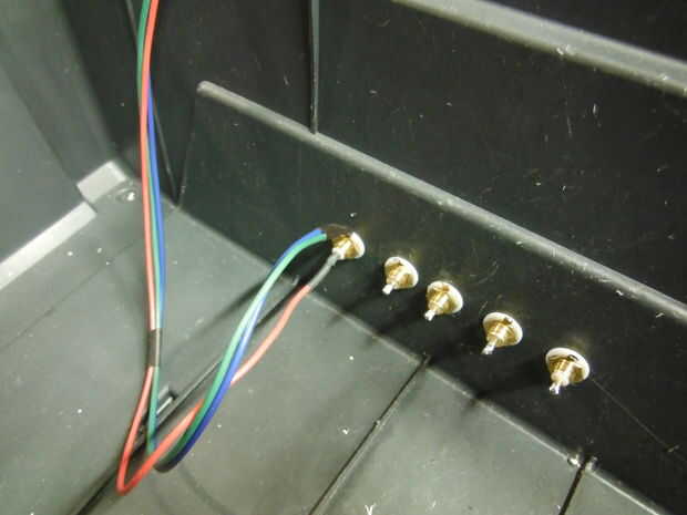 La parte principal del cable rojo es la curva del diodo de rectificador de la soldadura de los cables del diodo en forma de U en los dos exteriores contactos. Luego un cable puente va desde el contacto más cercano a la parte roja del LED (ver figura 1).  El otro contacto tiene un cable que va hacia el poste central en el conector hembra RCA son cerca de 18" de largo para que usted puede conseguir la bandeja fuera del camino para el reemplazo de la batería. Lugar varios pedazos de calor retráctil alrededor del alambre largo rojo pero no se encogen como éstos se utilizarán para agrupar los cables rojo, verde y azul juntos por conmutador.