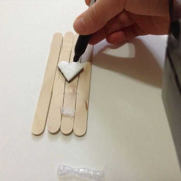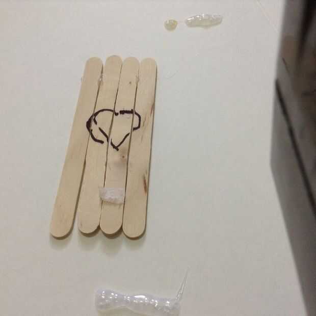 Sacar su pistola de pegamento caliente y pegamento cuatro palitos de lado a lado en una fila. Luego colocar la plantilla de corazón y comenzar a rastro. Después de que termines con eso, separar los palitos uno al otro. Ahora tienes el cuerpo principal de tu corazón.
