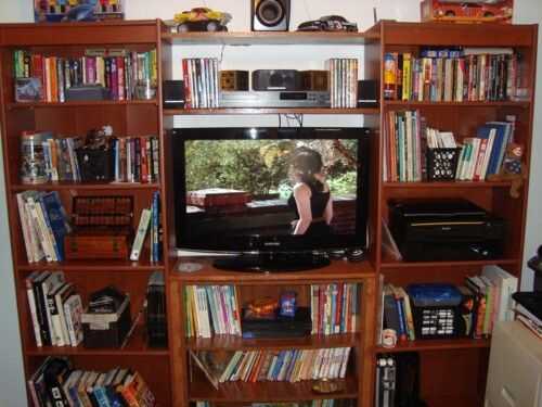 Quería poner una pantalla plana en mi oficina, había tres librerías y pensamiento que sólo encajan entre sí y hacer un entretenimiento centro. Pero - no! La TV era realmente demasiado grande para caber entre todas las piezas con ellos tope para arriba juntos. Se me ocurrió una forma para solamente $20 dólares para hacer la TV forma y los casos en un centro de entretenimiento.