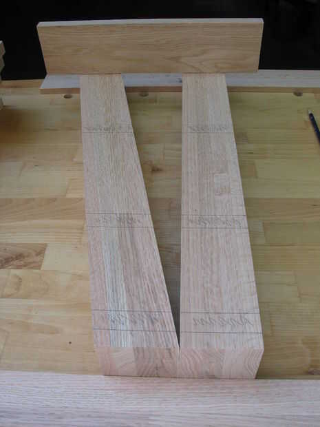 -Usando su ingleteadora, ajuste el ángulo de las patas delanteras. Marcar el sentido del corte en la parte superior e inferior de cada pata para que no cometas un error. El ángulo utilizado en mis patas delanteras fue de 12 grados (Nota: cuanto mayor sea el ángulo más pequeño será el estante superior) . Después de cortar los ángulos de las patas delanteras, colocar en la plantilla (en el ángulo correcto) y alinee las patas traseras para determinar cuánto material para quitar por lo que son la misma altura que las patas delanteras.