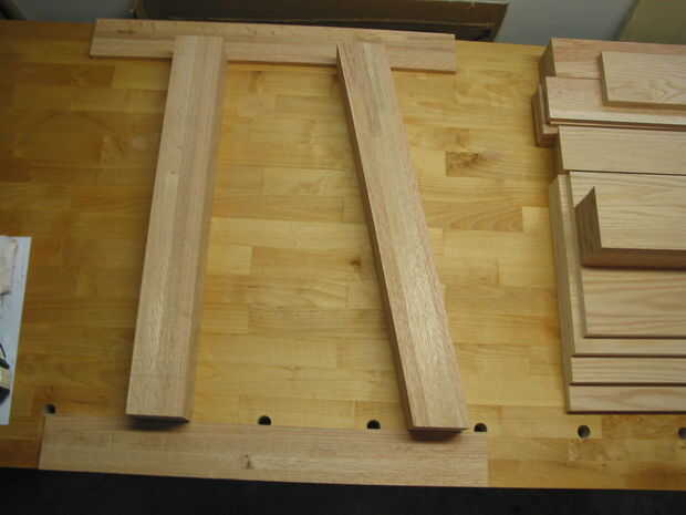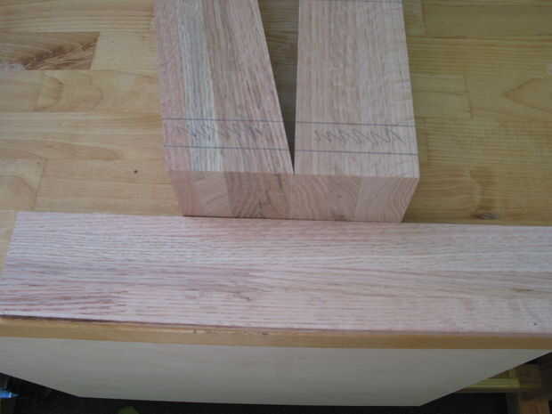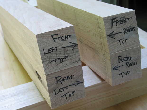 Se cortan las patas de dos piezas de 48" largo 4" x 4" S4S roble. S4S material surgido en los cuatro lados y se vende envasado en muchos centros de casa. Este tipo de madera, aunque más caro, elimina la necesidad de fresado complejo adicional que requieren Cepilladoras y Canteadoras, equipo no utilizado por los carpinteros aficionados y aficionados a los hobbys.