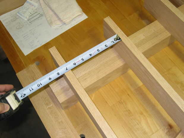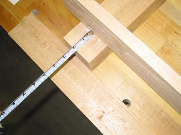 -A continuación coloque un 3/4" pieza gruesa de madera contrachapada sobre las piernas en la posición del estante inferior, midiendo cuidadosamente para asegurarse de que es una distancia adecuada de la parte inferior de la parte delantera y trasera de la pierna (Foto #3) y marque la ubicación de la ranura.
