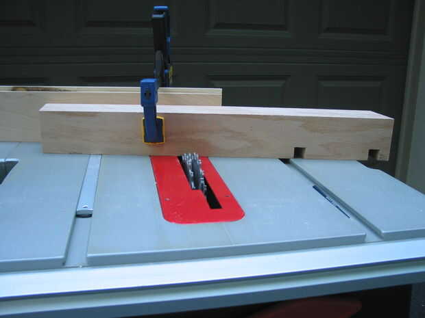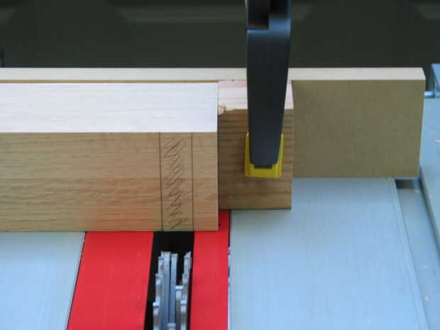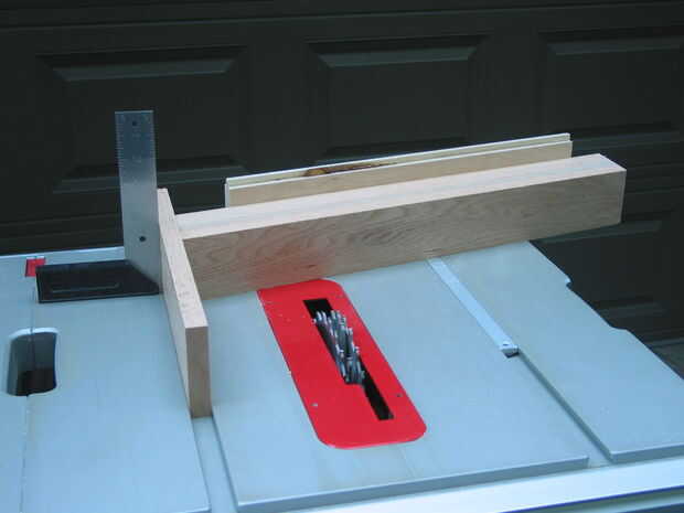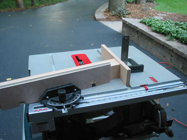 Lo más importante a recordar cuando corte las mortajas que se cortará cada pata delantera con una mitra diferentes la ranura de la Sierra de mesa y que el ángulo situado en el calibre de ingletes también tendrá que invertirse. Como se ve en las fotos #6 y #7, la exactitud del ángulo en el calibre de ingletes se puede confirmar mediante la colocación de un tablero en el inglete medidor de ranura y, utilizando un cuadrado para asegurarse de que es perfectamente vertical, empalmar la parte inferior de la pierna contra él. Si no conocen perfectamente, el ángulo de inglete tendrá que ajustarse.