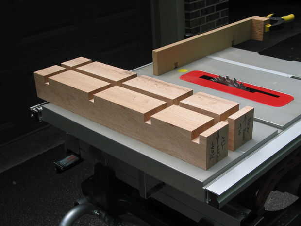 Corte las mortajas de las piernas es quizás el paso más importante y difícil en la construcción de este proyecto. El ángulo de las patas delanteras debe precisamente replicar en cada dado para los estantes ser nivel. Esta tarea es complicada por el hecho de que el ángulo de inglete tendrá que invertirse y la ranura de inglete opuesto cuando corte la pata frontal oposición en la mesa de la sierra. Por estas razones, piense con mucho cuidado este paso y, lo más importante, tómese su tiempo!