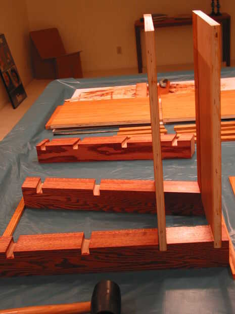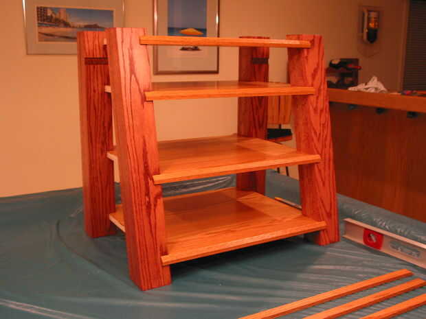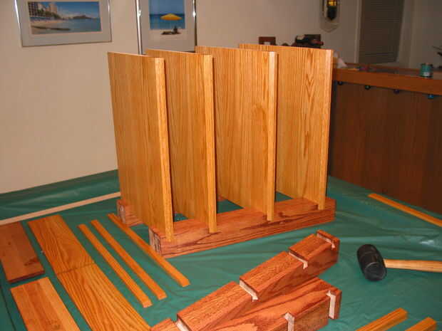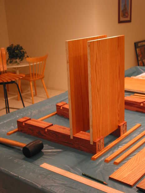 Segundo: Cuando todos los estantes en su lugar, agregue cuidadosamente el otro frente y pata trasera a la Asamblea de la plataforma. Puede que necesite utilizar una goma mazo para golpear ligeramente las piernas totalmente en las mortajas así que asegúrese de que todos los estantes se alinean correctamente. Foto #5 muestra cómo he comprobado visualmente mi alineación de estante.