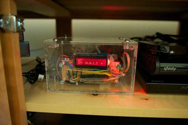 Contamos con un Arduino montado dentro de uno de los gabinetes, que controla varios LEDs infrarrojos apuntando a los sensores en nuestro reproductor de DVD, caja de cable, amplificador, pantalla, Apple TV y mezclador de vídeo. Arduino está conectado a nuestra red wifi de casa, así que podemos controlar desde nuestro iPhone en una aplicación que escribió mi papá. Esta aplicación es básicamente una versión simplificada y condensada de los 6 mandos que normalmente tenemos que ver la televisión o una película o escuchar música. Por ejemplo, con la simple pulsación de un botón de "Watch DVD", la aplicación para iPhone se conecta a nuestra red wifi dice el Arduino a flash la secuencia correcta de IR para convertir todo encendido, las entradas de TV y amp 'Reproductor de DVD' y abre la unidad de disco en el reproductor de DVD. La aplicación cambia entonces a un panel de control DVD específico con los controles para reproducir y pausar el reproductor de DVD, y controles de volumen para el amplificador.