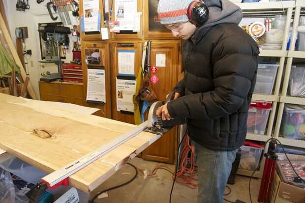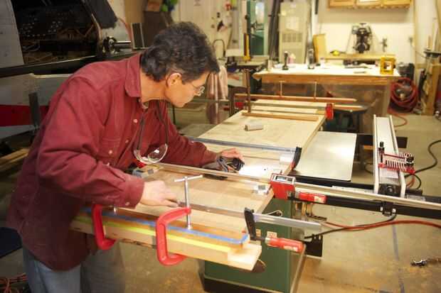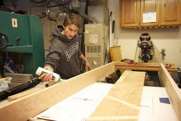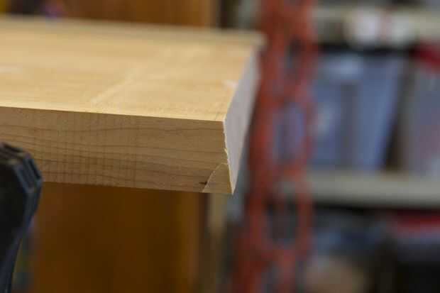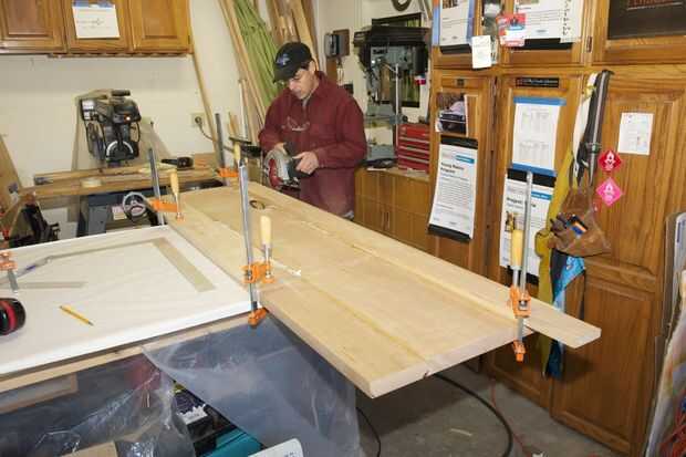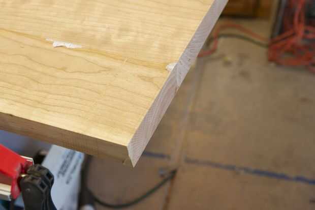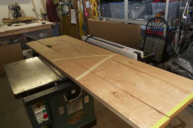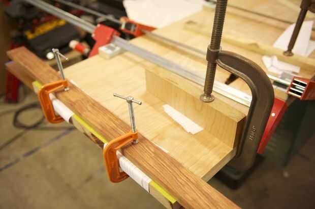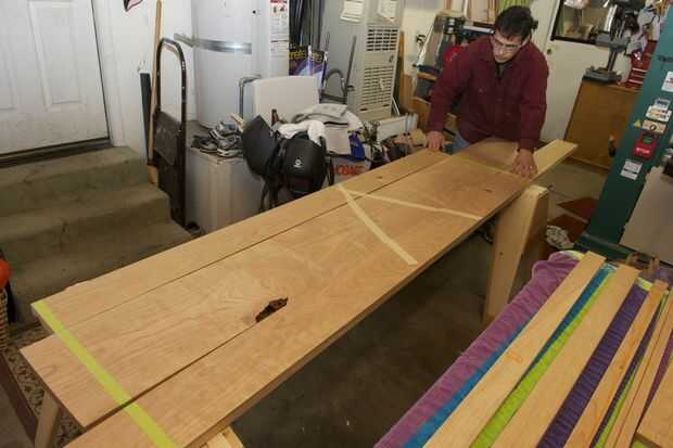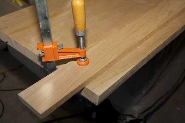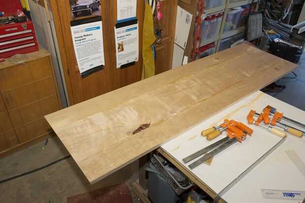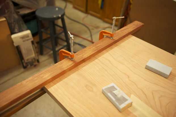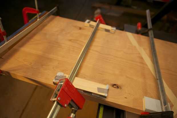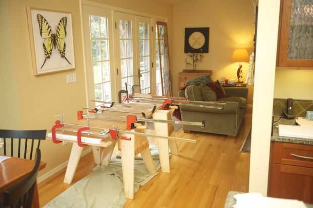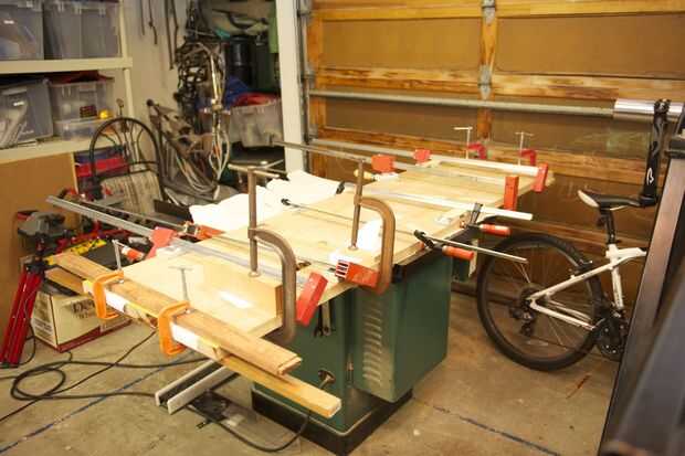 Una vez que estábamos convencidos de que esto debería funcionar, nos deshizo a abrazaderas y preparado para el real pegamento para arriba. Aplicamos pegamento Titebond III a ambos lados de cada articulación y sujeta todo para arriba, asegurándose de limpiar gotas de exceso de cola. Después de un coldish secado día y noche en el garaje, hemos decidido mover interior donde estaba el calentador para asegurarse de que el pegamento realmente seque correctamente. Mamá gracias por dejarnos poner caballetes en la cocina!