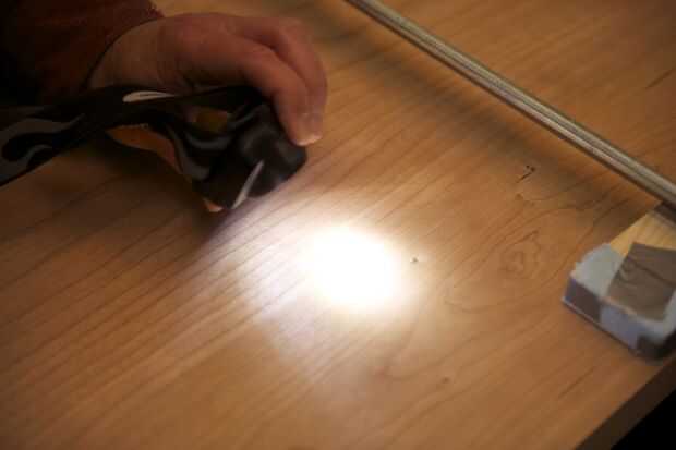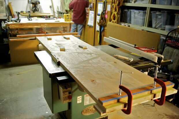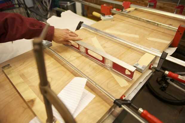 Una vez que tuvimos los tres de nuestros tableros Centre, hicimos una pinza de prueba para arriba para asegurarse de que todos los huecos en las juntas cerradas. Nos dimos cuenta de que mientras que los boquetes fueron cerrados, los tableros fueron deformados bastante que teníamos que añadir abrazaderas verticales así como horizontales abrazaderas para mantener las juntas en el mismo plano. Ideamos un método de sujeción de toda la tabla de arriba a la cama de Sierra de mesa plana, rígida para ayudar a este proceso de aplanamiento. Con una linterna en un garaje oscuro que nos ayudarán a ver grietas y aberturas, decidimos este método realmente trabajado.