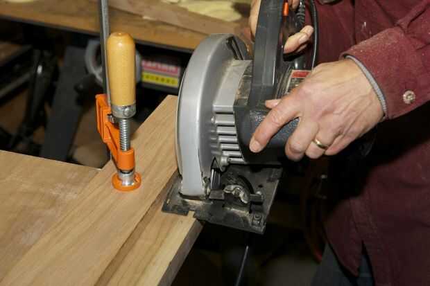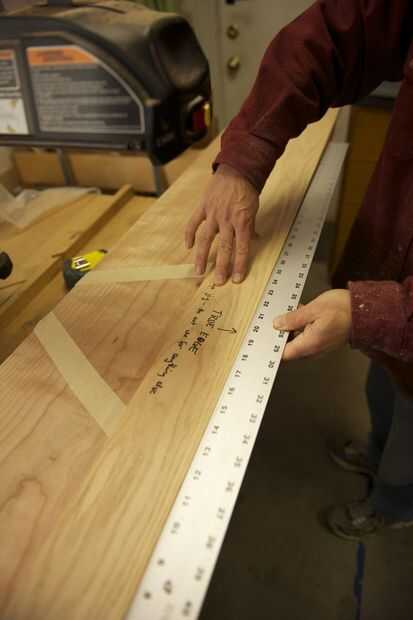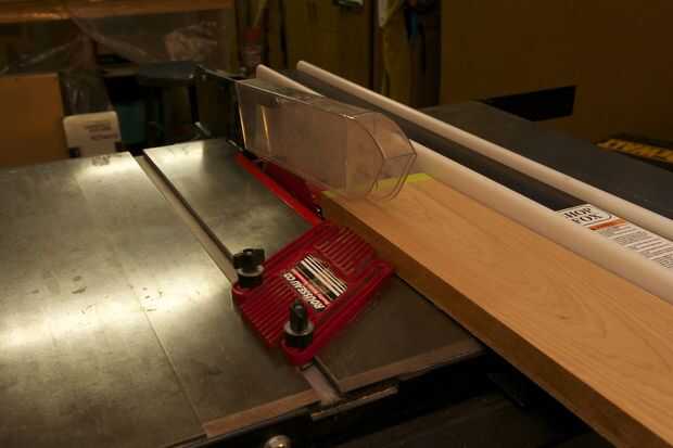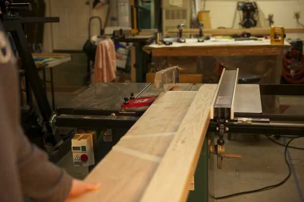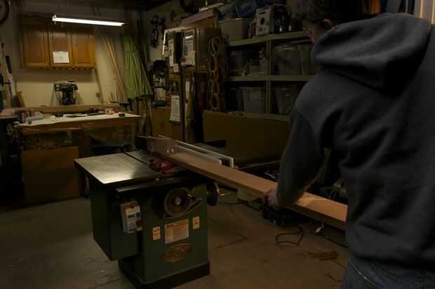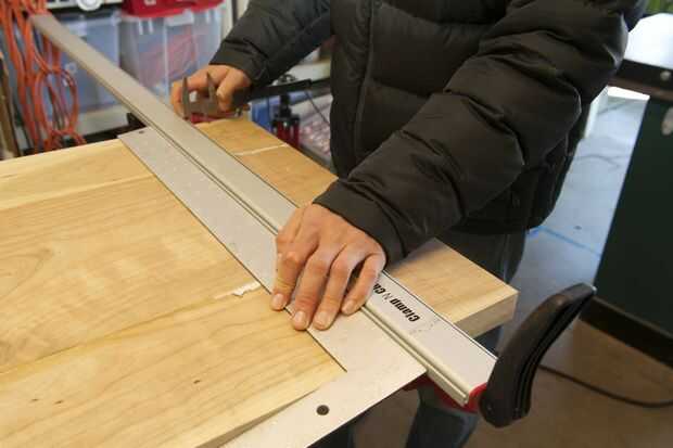 A continuación hemos cortado ambos bordes de cada panel para obtener una superficie lisa recta agradable para aplicar pegamento a. La técnica general para este paso aprovecha áspera de la Junta "verdadero borde". Toda la madera áspera se supone que tienen un borde verdadero, lo que significa que el borde se supone que es más o menos recta. El otro borde puede ser tan flojo como siempre, pero como tienes que un borde relativamente cierto, puedes poner que el borde contra la mesa vio cerca, luego cortar el lado flojo. Entonces, la Junta alrededor de los bancos y colocando el borde limpio que acaba de realizar con la cerca, usted puede cortar el borde relativamente verdadero para que tenga un borde verdadero real. Ahora te quedan con dos bordes de corte limpios en la madera previamente áspero.