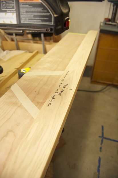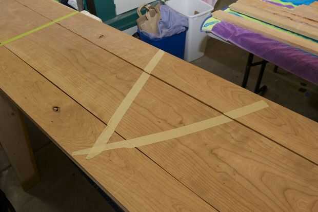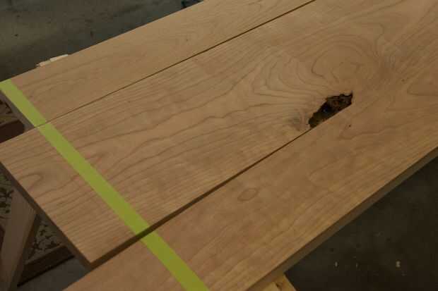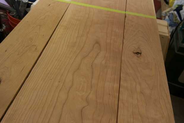 Utilizamos tres tableros de la mesa, dos ~ 7 pulgadas piezas colocando una pulgada de ~ 11 piezas. La tapa final debe estar un poco menos de 22 pulgadas, esta configuración nos dará algunos extra para recortar a cada lado en el final. Una vez que hemos averiguado el arreglo nos graba un triángulo grande en la parte superior para que nos podemos alinear las placas fácilmente.