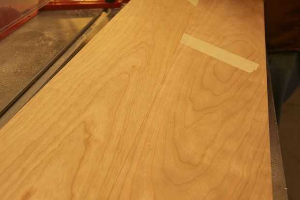 Después de que el pegamento seque para otro día, hicimos los cortes de la dimensión final en la tabla superior. Queríamos un ligero bisel en los lados y los bordes delanteros de la parte superior (no la espalda porque se tope contra la pared, así que el borde debe ser recto). Usé un medidor de ángulo y el bosquejo modelo en mi portátil para transferir el ángulo correcto a nuestra Sierra de habilidad. Utilizamos una sierra de habilidad y una guía para estas cortes en lugar de la tabla VI porque la parte superior es tan pesada que más fácil mover la Sierra de la pieza de trabajo, jaja. Antes de cortar, aplicamos cinta adhesiva a la parte superior y bordes inferiores de la mesa para evitar rasgan hacia fuera.