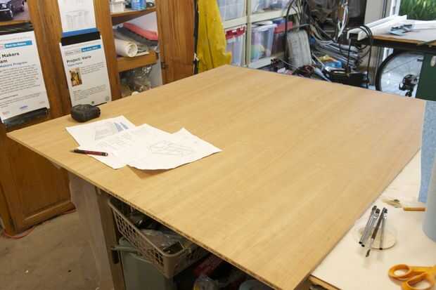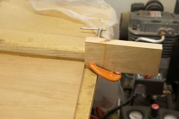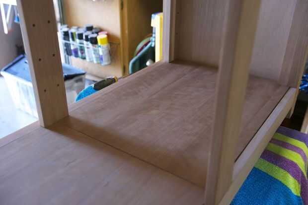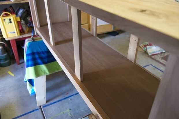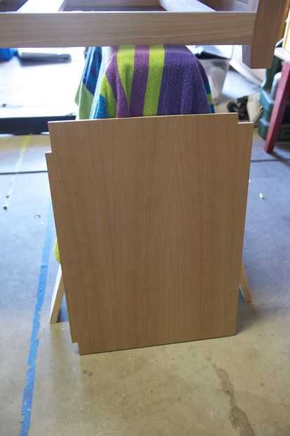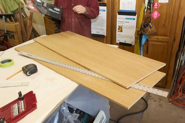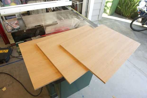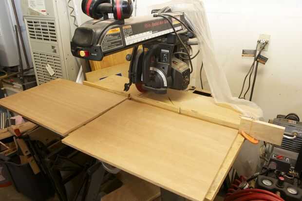 Primero nos arrancaron la madera hasta el ancho en la Sierra de mesa, y luego utilizamos nuestra Sierra de brazo radial a cortar cada trozo. Porque hay algunas piernas y barras verticales que se proyectan en el espacio alrededor de las esquinas, tuvimos que hacer varias muescas en las esquinas de cada panel de piso por lo que encajaría. Utilizamos nuestra Sierra de cinta para hacer las muescas de la esquina.