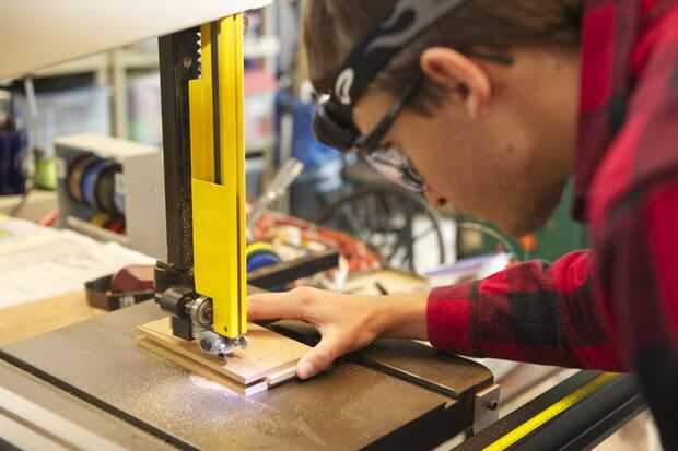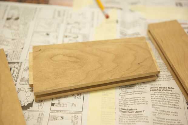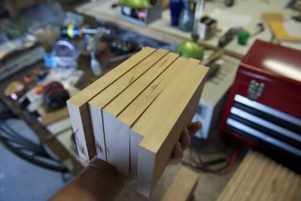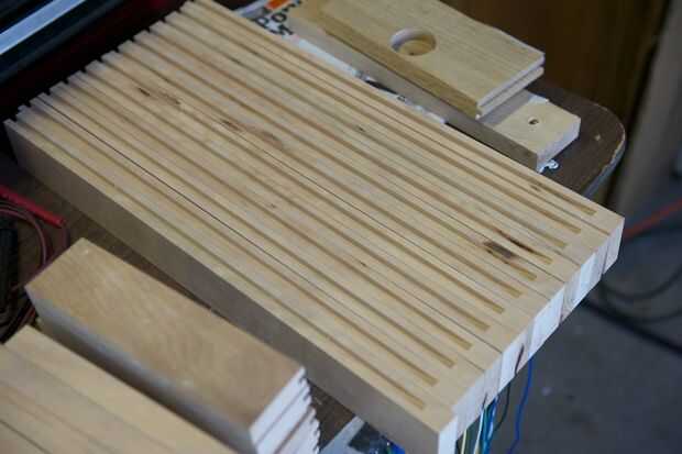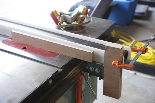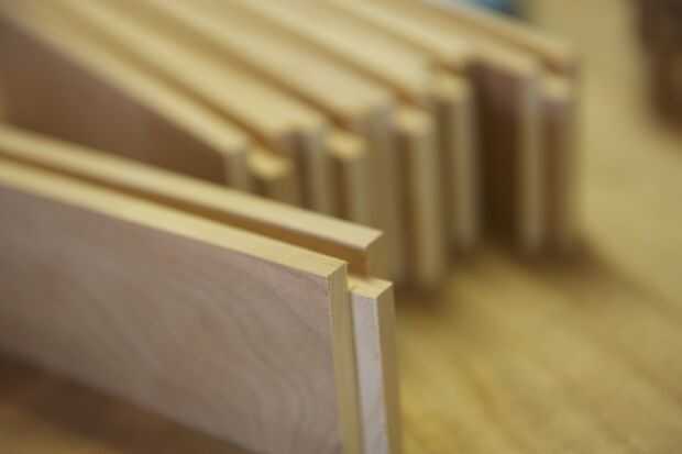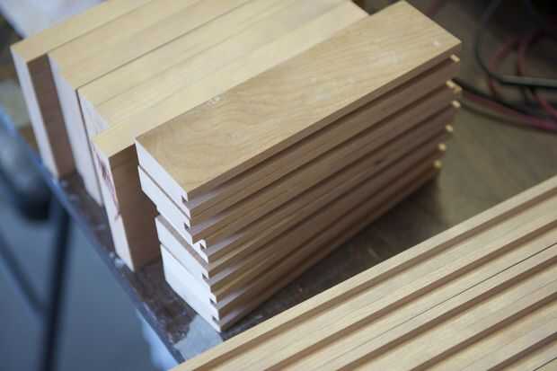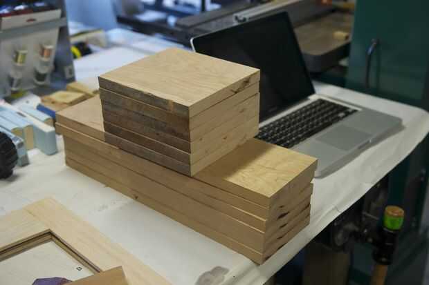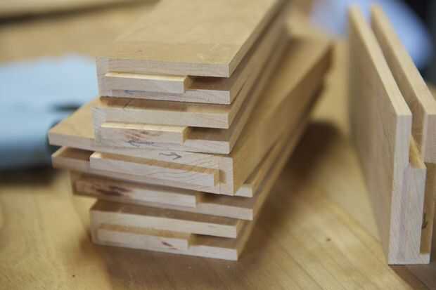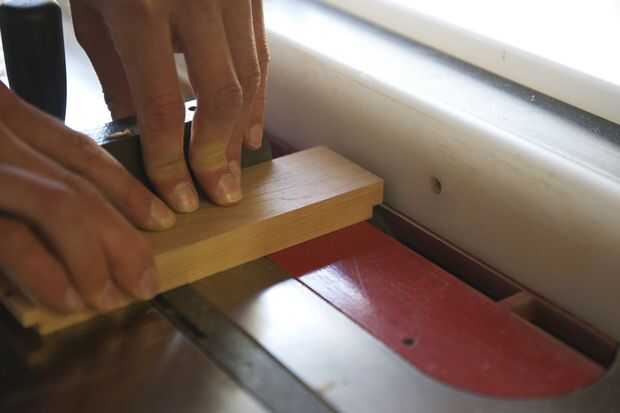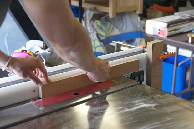 Después de cepillar las juntas cerezas, utiliza nuestra Sierra de rasgar las piezas de anchura y luego utilizar una parada en la sierra radial del brazo para asegurarse de que todas las piezas correspondientes eran la misma longitud.