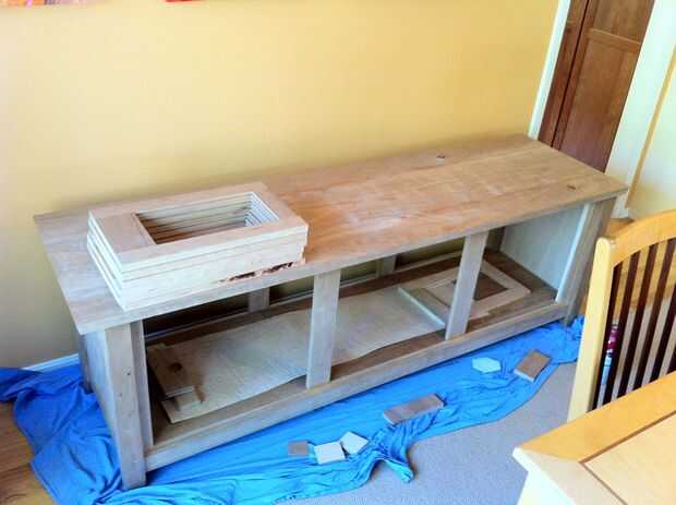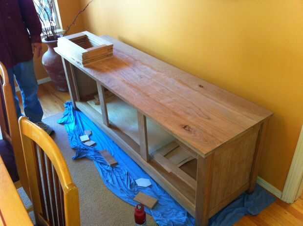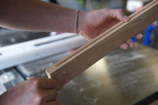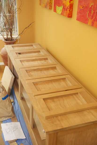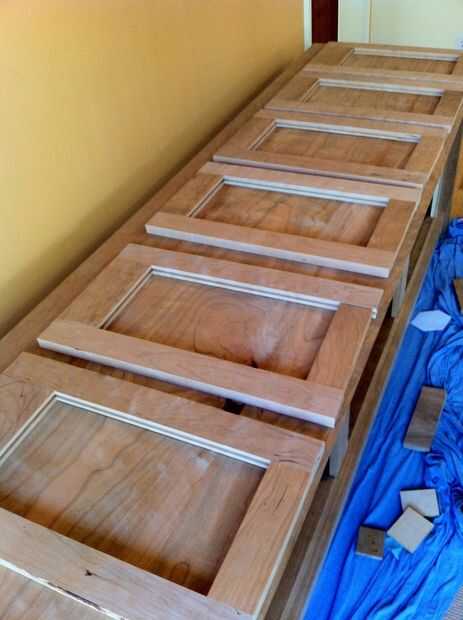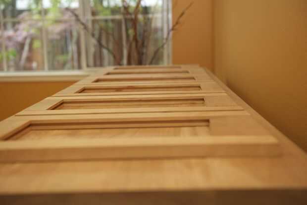 La pieza superior en cada puerta tiene un arco, así que total hay un arco grande en la parte superior de los gabinetes. Porque más fácil cortar la ranura ranuras si el borde es recto, corte el corte de gran tamaño (de ancho), pieza superior un surco profundo y entonces se usa la sierra para obtener el arco.
