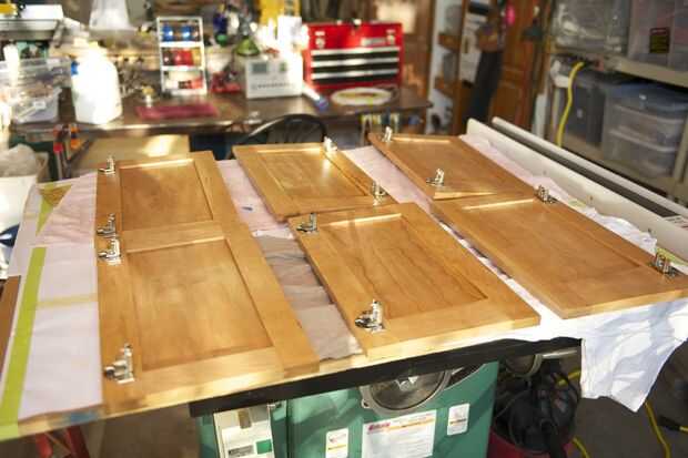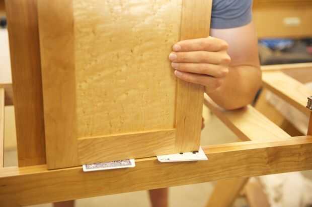 Queríamos una brecha constante a lo largo de la parte inferior de las puertas, todo el camino a través de las seis, así que utilizamos pilas de cartas para definir la brecha en cada puerta en cuando los tornillos para montarlo en el bastidor. Cada naipe es casi exactamente 1 centésima de pulgada de grosor, por lo que hemos apilado 5 para darnos un espacio de. 05" a lo largo del borde inferior.