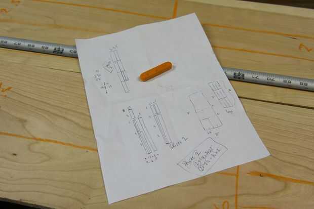 A continuación utilizamos tiza para bosquejar hacia fuera áspera colocación de cada falda en la madera. Había también algunas otras piezas como las 'columnas' (que verás más adelante) que tuvo que cortarse de las tablas de la misma, por lo que apostaba en demasiado. Esta técnica de marcar con tiza hace que realmente tenga suficiente madera para todas las piezas que va a cortar de ella!