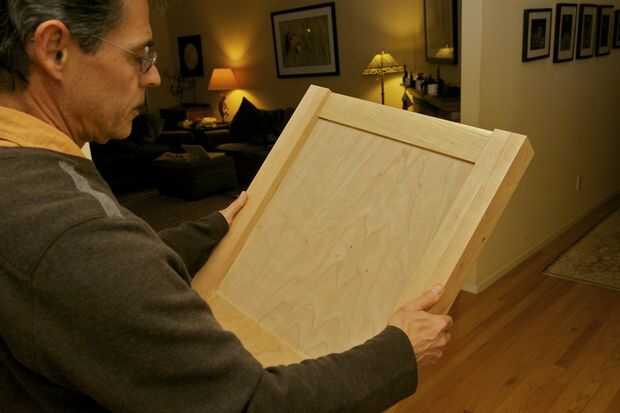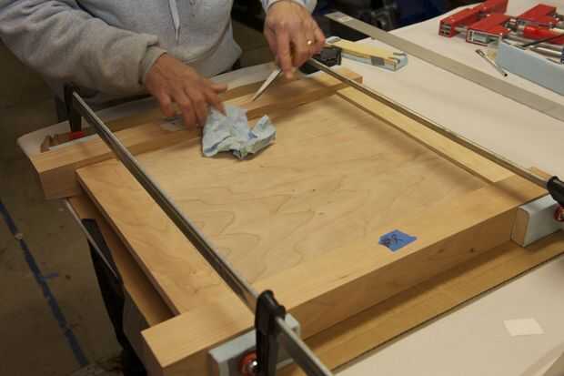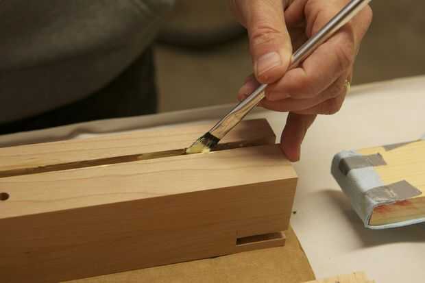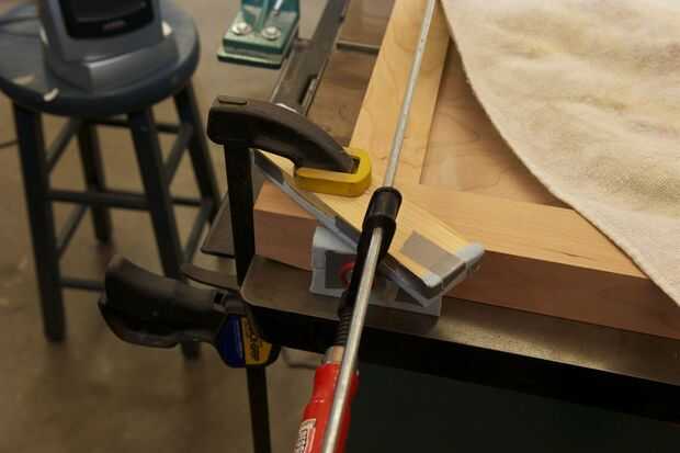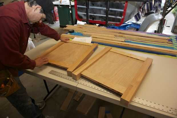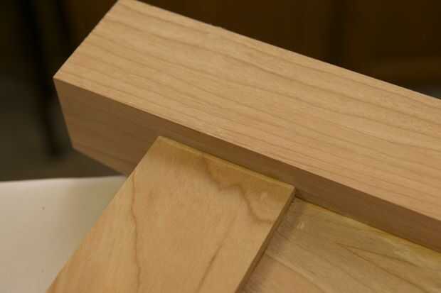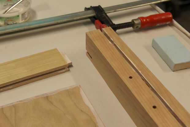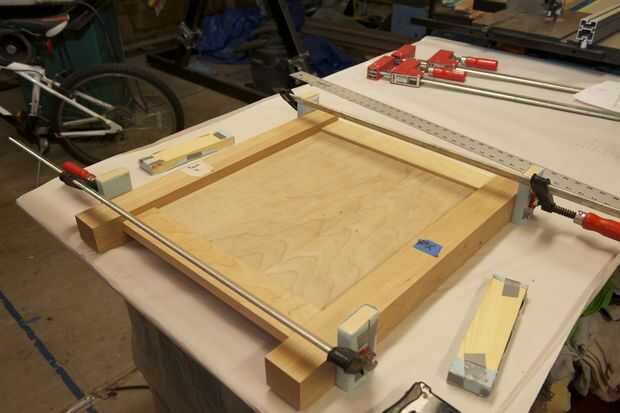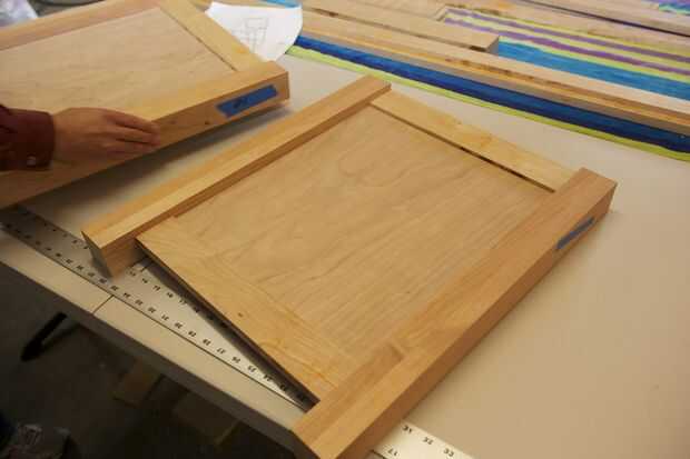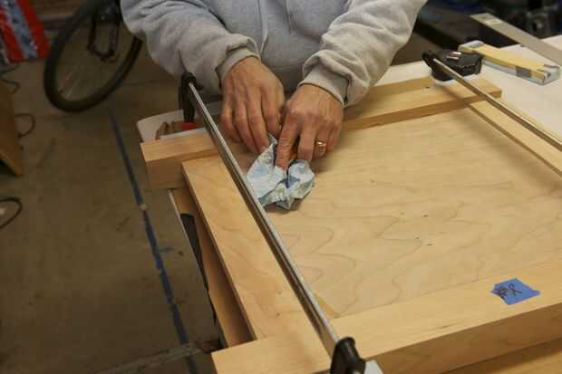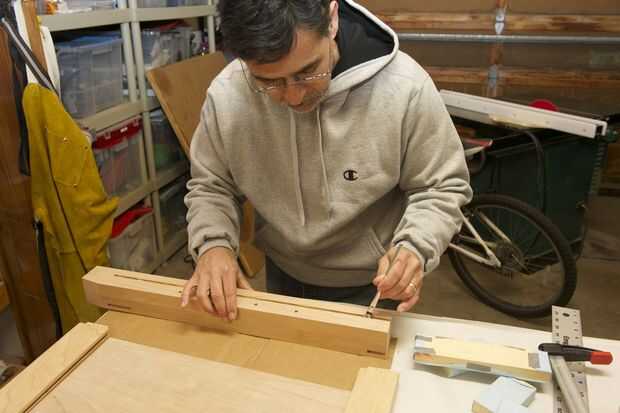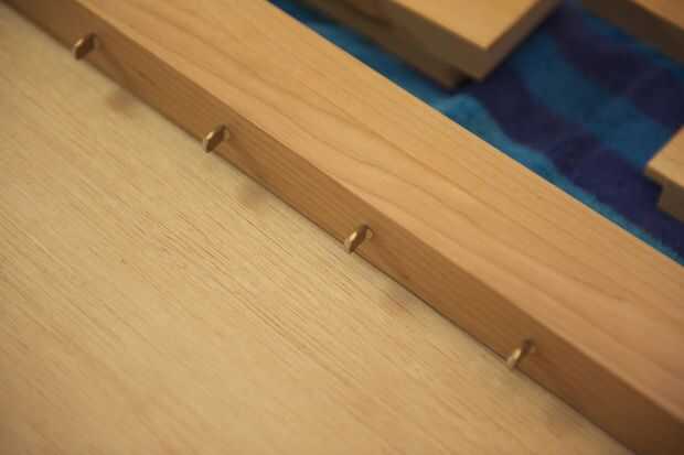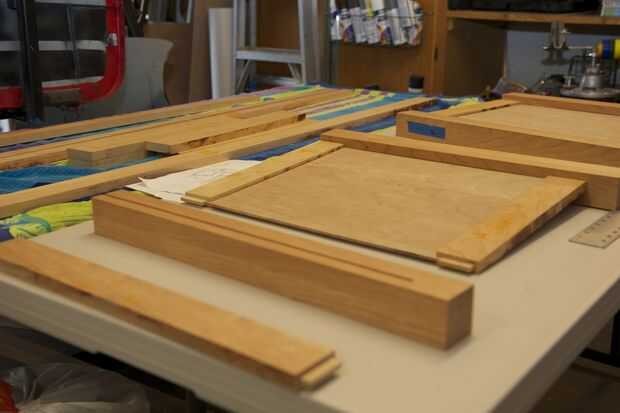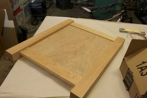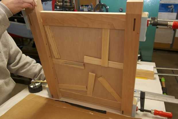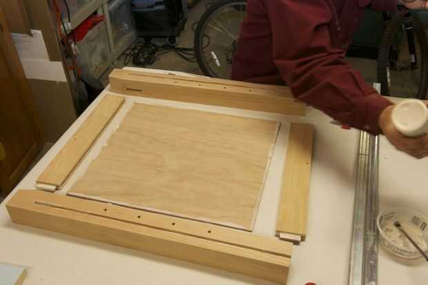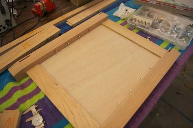 Una vez que los paneles de la corte, hicimos una prueba con todas las piezas. El revestimiento se ajusta a los canales que cortamos en el interior de las piernas y faldas del lado. La canalización era un poco ancha para la madera contrachapada, así que cuando nos pegue arriba usamos cuñas de la parte posterior para asegurarse de que no había espacios en el exterior (ver foto de arriba para más explicación sobre esto).
