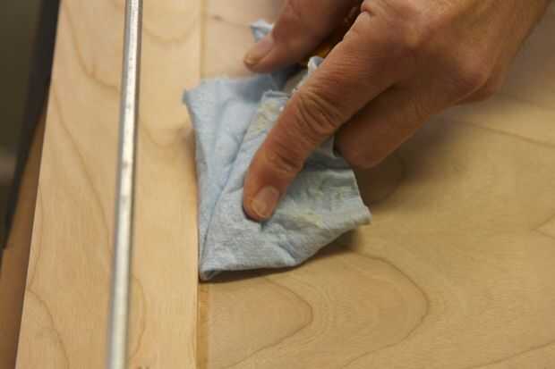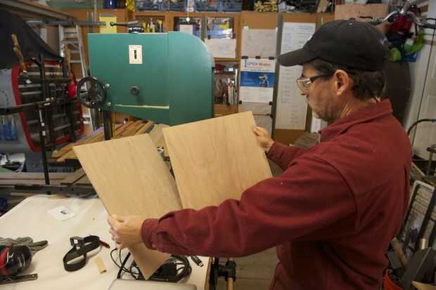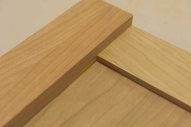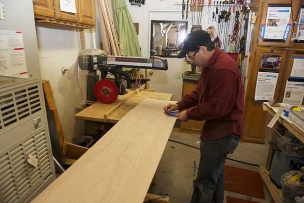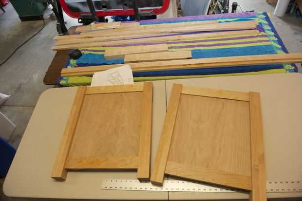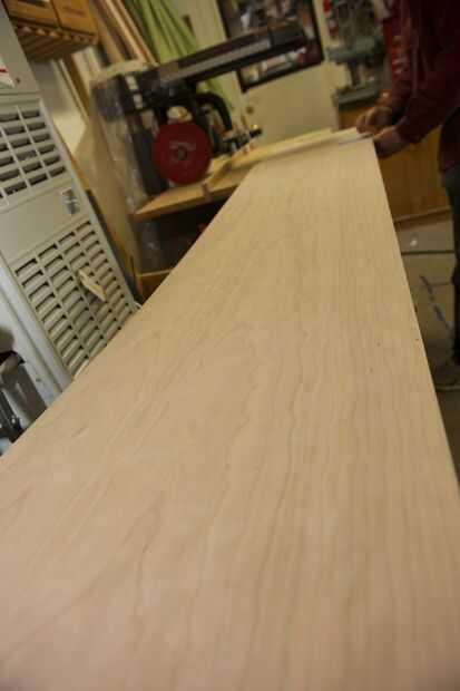 Utilizamos 1/4 de pulgada figurado madera contrachapada cereza para el revestimiento de los paneles laterales, y estos hasta longitud cortamos con la sierra radial del brazo. Tuvimos que rasgar a la anchura correcta después de, y lo hicimos con la Sierra de mesa.