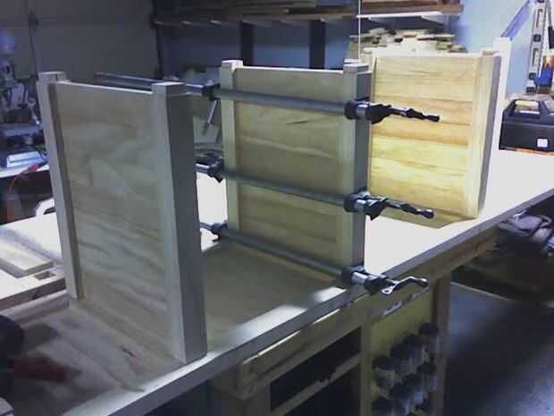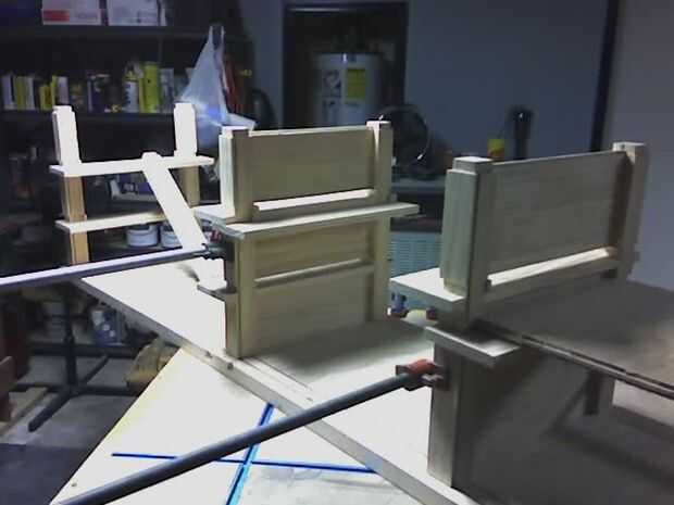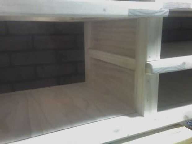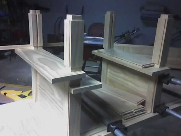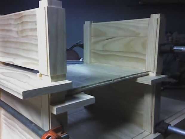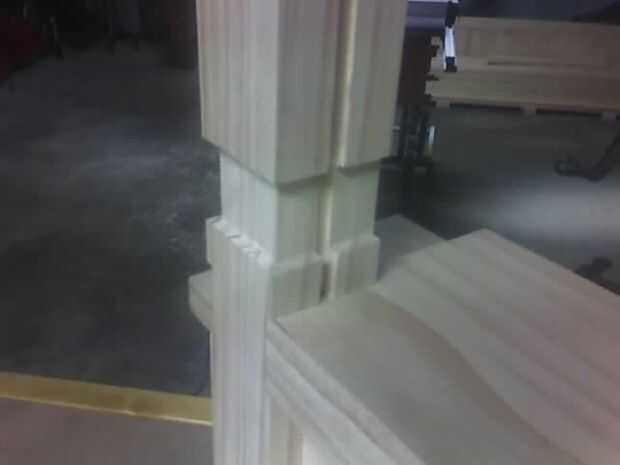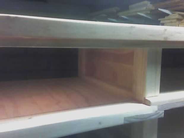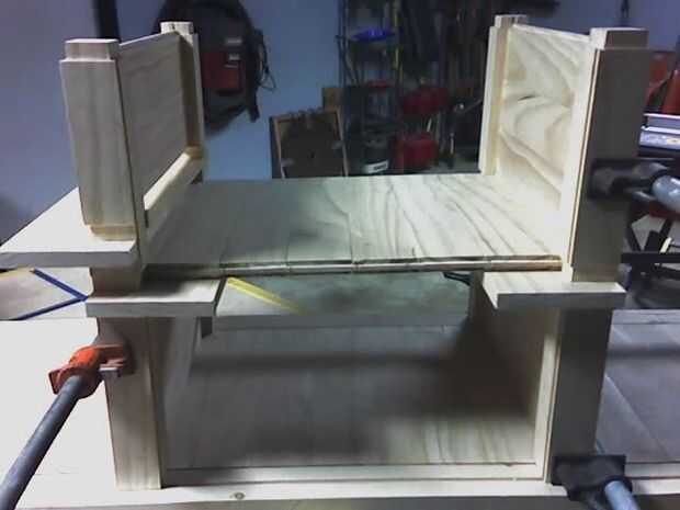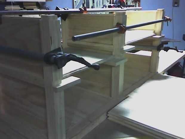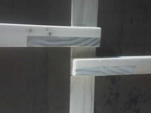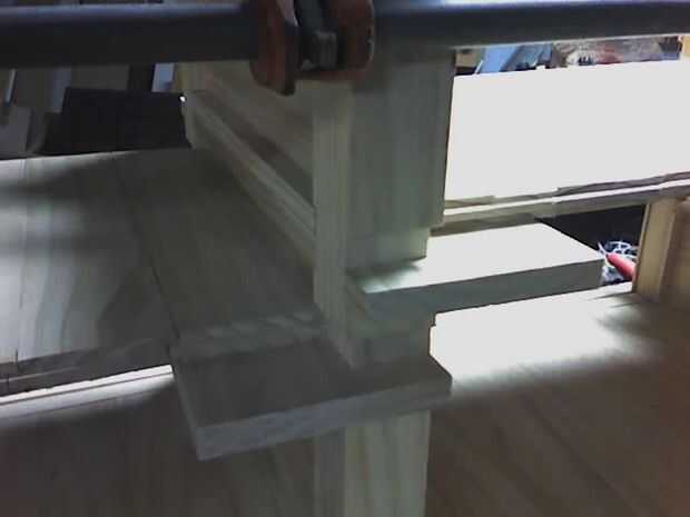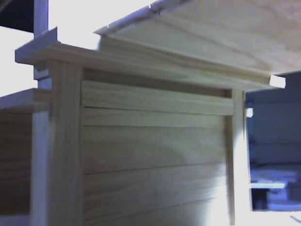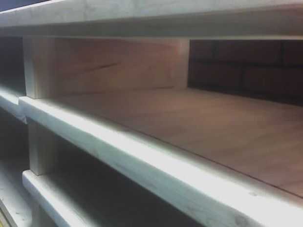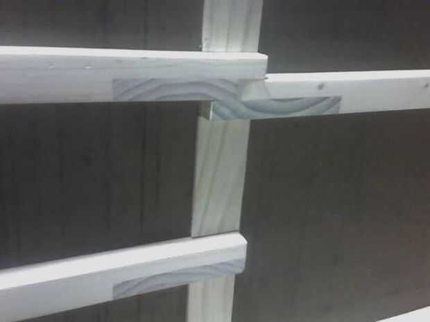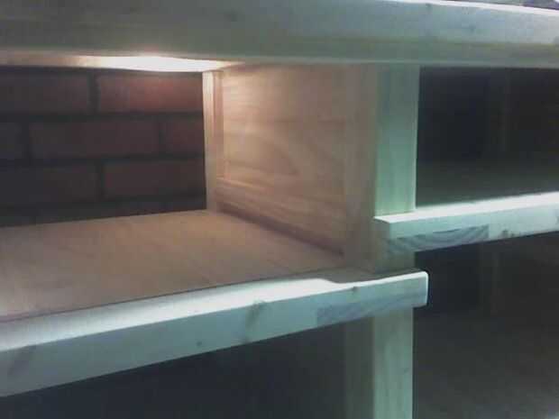 Los estantes son todas de construcción machihembradas y se ligan en los bordes por la barandilla. Cada estante con abrazadera en su lugar por los tablones que conforman las paredes.