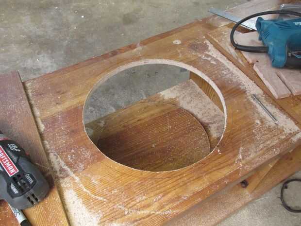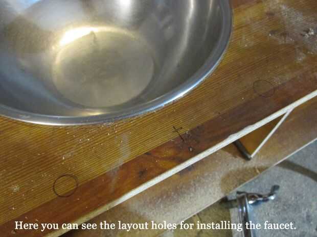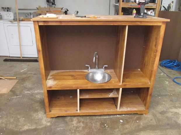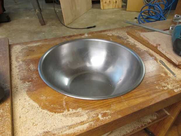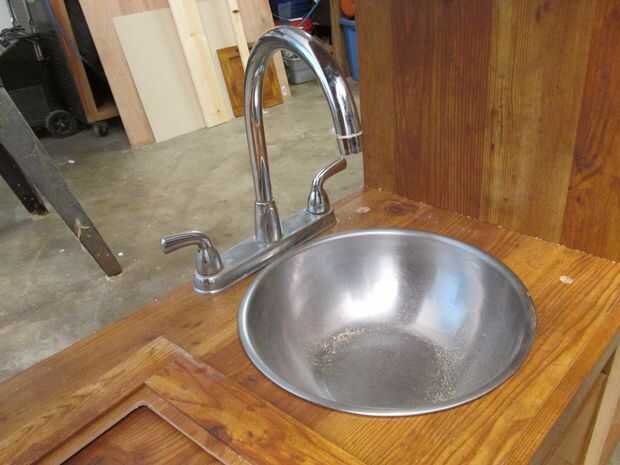 Bien, con el centro de entretenimiento reorganizado y reforzado, el siguiente paso fue a saltar a la derecha en agregar el fregadero. El fregadero de la cocina de juego consiste en un metal grande mezcla bowl y un grifo antiguo, que he podido recoger por 3 dólares en mi tienda de salvamento de construcción local. He decidido instalar el fregadero en la cocina como hace el más sentido con el espacio disponible, su kilometraje puede variar. Para instalar el fregadero he medido y marcado el centro de la zona donde queria instalarlo y luego utiliza un compás improvisado (limpiador de pipa + tornillo + sharpie) para marcar un círculo apenas lo suficientemente grande como para caber el tazón de fuente pero más pequeño que el diámetro total del tazón de fuente como yo quería que el borde de la palangana para descansar sobre la encimera para que no caiga el tazón de fuente a través de la abertura. A continuación que utilicé una sierra de calar para cortar cuidadosamente a lo largo del círculo hasta que había creado el agujero de la taza del fregadero de metal. Un ajuste de prueba rápida y el fregadero se ha caído al lugar perfectamente.