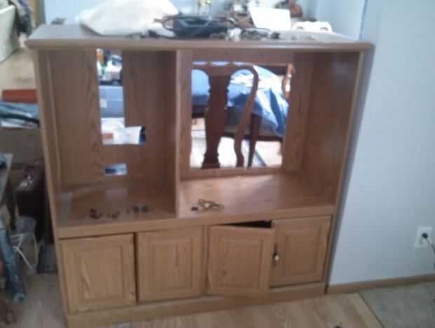 Quite todo el hardware desde el centro de entretenimiento. Coloque todos los bits y piezas en bolsas de sándwich y etiqueta las bolsas con un marcador de mantenerlas organizadas para más adelante. Esto le ayudará a recordar lo que volver a poner donde. Si el gabinete tiene cristal en él como el mío lo hizo, yo recomendaría cuidadosamente quitar el vidrio y reemplazarlo con algunas de esa madera. Más que probable que es cristal de seguridad y muy difíciles de romper, pero por si acaso, permite mantenerlos pequeños tan segura como sea posible. Si eres para la risa y no cuenta un poco de lenguaje adulto, ve lo que ocurrió cuando traté de 'eliminar' el vidrio de la puerta de mi armario... con un martillo... y falló.