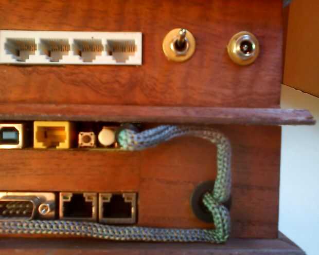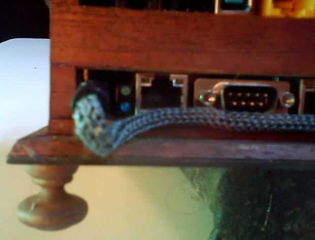 Los conectores de suministro de energía de los dos 12 Vdc tableros son visibles en la parte trasera de la caja se colocaron alambres cubiertos de encajes.