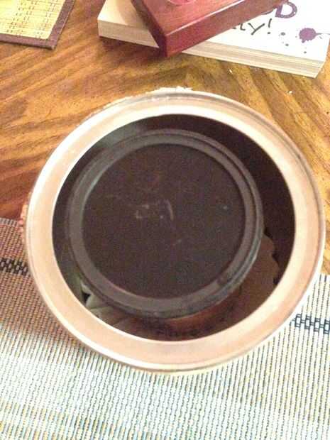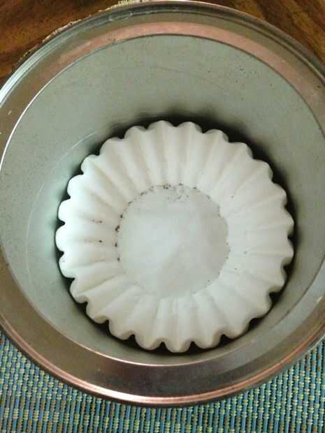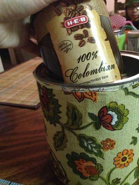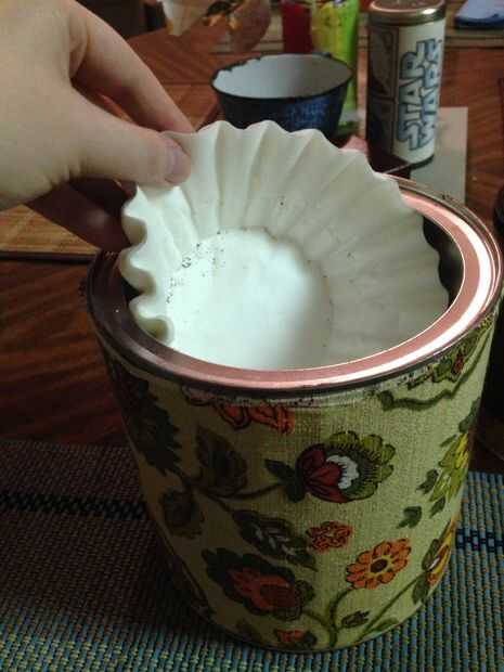En primer lugar, tomar su café grande puede y limpiar hacia fuera y secarla bien (enunciados que se seque durante la noche, es difícil de secar esas cosas con una toalla). Luego simplemente cubre con bastante papel, tela, o pintar todo... o dejarlo como está, si te gusta la etiqueta que ya está en él. Saque una pequeña pila de filtros de café y meter en el fondo de la lata de café.
