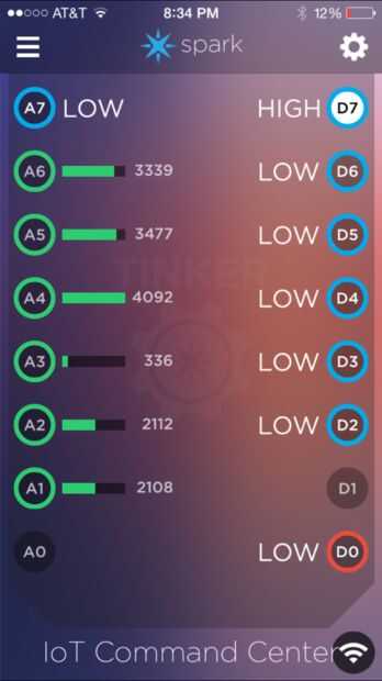 Una de mis partes favoritas sobre el uso de la base de la chispa son la aplicación de Tinkery su IDE(Build) Web. La aplicación de Tinker te permite ver el estado de los pines digitales y analógicos del núcleo de la chispa donde quiera que estés. La chispa Web IDE(Build) le permite flash un programa para tu dispositivo desde cualquier lugar del mundo. Es bastante grande. Esto me parece particularmente útil para la Electron(Cellular Dev Board) chispa que sale pronto. Podría poner este centro de comando de IoT hacia fuera en un campo en algún lugar con un panel solar y nunca tiene que tocar otra vez.