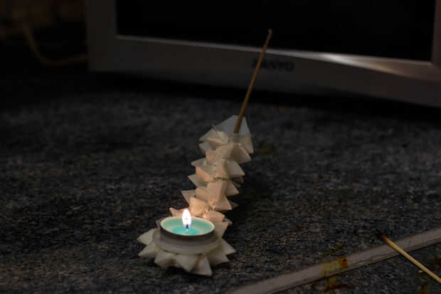 Dejar secar y si es necesario, por su elección del pegamento, retire el exceso. Si el pegamento se seca claro, esto no debería ser una molestia que la única instrucción para su uso es para no cubrir el orificio superior y para apreciar el incienso/vela usada aquí, siente al ayudante de meditación en un lugar cerrado, tranquilo y poco iluminado ambiente