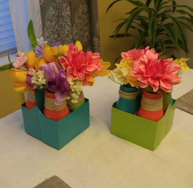 Este proyecto de bricolaje crea hermosos centros de mesa de upcycled Starbucks Frappuccino cuatro paquetes de botella de vidrio. El tiempo total del proyecto es alrededor de 25 horas, incluyendo tiempo de secado para pintura. Este es un divertido proyecto que permite realizar una decoración personalizada para su hogar o eventos. Los centros de mesa son sencillos de crear y no requiere ninguna habilidades particulares.