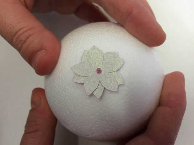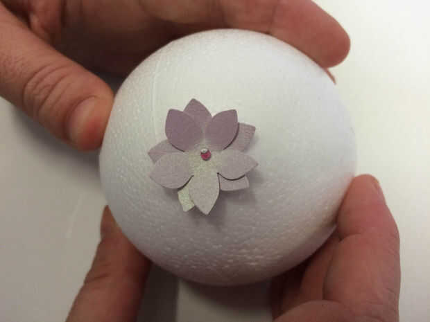 Presione el pasador en la bola de poliestireno, lo más recta posible (no importa demasiado si pines están un poco chuecos, pero si son muy torcidos, puede causar problemas cuando intenta Presione otras flores más adelante). Una vez hecho esto, exprimir los pétalos de la flor hacia arriba ligeramente para darles alguna forma.