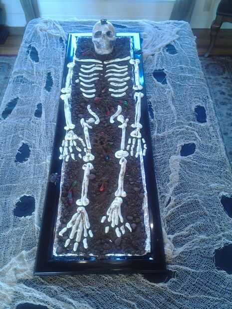 Que nos Forramos un espejo "sobre la puerta" a utilizar como una bandeja de servir, cubierta con suciedad, arreglar los huesos. Polvo de los huesos con un poco de polvo cacao agregar algunos años y detalle. Añadir algunos gusanos gomosos y arañas y ahí está.