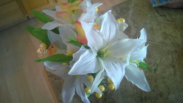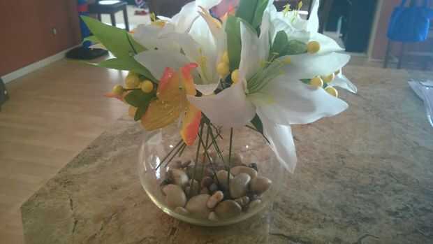 utilizamos flores de seda para nuestros Ramos y para todas nuestras decoraciones.Íbamos a utilizar seda margaritas flotando en un tazón para nuestros centros de mesa. Probamos hacia fuera en su casa un día antes de la boda, y las margaritas inmediata