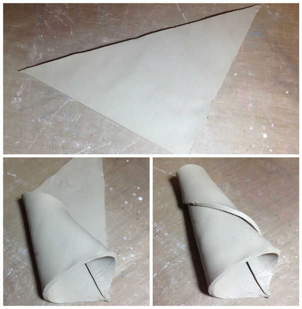 Empezar haciendo una forma de cono básico – estirar y recortar un triángulo 6" mitad-Plaza de arcilla en aproximadamente 3/16" de espesor. Enrollar el punto izquierdo hacia arriba y presione juntos, entonces el punto alrededor del rodillo en la parte posterior. Deslice una espátula bajo la arcilla para quitar su alfombra no se pegue.
