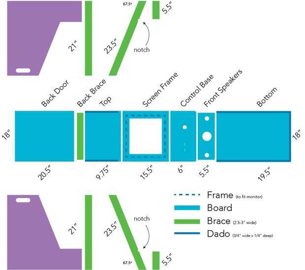 Luego es hora de hacer la caja. Después de mis diseños, se me ocurrió con estas medidas en la foto de arriba. Recuerde que un montón de estas medidas será necesario alteraciones dependiendo del tamaño de la pantalla/joystick/botones/altavoces/ojal, etc.. Además, tenía algunas lagunas feas entre las conexiones de madera en algunas partes, por lo que acabo de creativo en la forma cubrir para arriba. No necesita ser lindo trabajar.