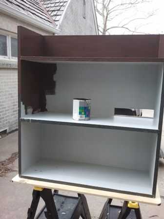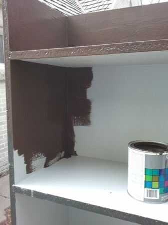 Una vez más, no quería pasar una gran cantidad de dinero en este proyecto, por lo que fregó el gabinete de pintura en el garaje. (Me encanta jugar en el garaje de mariditos! tantas herramientas, tan poco tiempo!) Tenía un cuarto de galón de pintura sobrante en un marrón chocolate... ¡ Bingo! Ahora, sé que para ser pintado "perfecto" debo han utilizado una imprimación primero, pero puesto que la librería ya había sido pintada y sinceramente estaba demasiado emocionado terminarlo, I (con un poco de ayuda) apoyado lo boca abajo sobre caballetes en la calzada. Era un día soleado y proporcionaría gran ventilación. (tome nota, no utilizo una lona debajo, otra vez en mi prisa por terminar... se puede considerar para evitar caídas y derrames en su entrada)