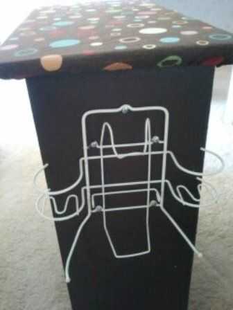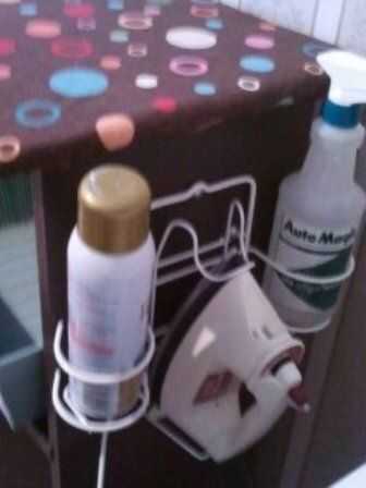 Ahora, muchos de ustedes no tenga este accesorio de alambre impresionante planchar cubierto solo poniendo alrededor. Yo lo hice... probablemente 5 años y nunca logró colgar en cualquier lugar! Supongo que "Él" sabía que estaba destinada a un propósito mayor. Rápidamente pensé cómo impresionante se unió al lado de la librería, mantendría mi plancha y almidón y botella de agua práctico y fuera de la superficie. BINGO otra idea brillante. Si usted compra en cama baño y más allá, Walmart o cualquier tienda del centro, estoy seguro de que usted puede comprar uno... confía en mí, su bien vale la pena! Pido disculpas que no tienen una foto de la eléctrica aquí, pero tenía maridito conectar una regleta en la parte inferior, también otro accesorio ingenioso. El "otro" lado miraba desnudo, y cree mi propia simétrico, lo que un buen lugar para almacenar verticalmente todas las reglas de mi acolchado! Así, tomó un gancho de ojo y había doblado hacia fuera recto y había atornillada en el lado. (Un gancho de taza café funcionaría... No estoy seguro de lo que se denomina el "nombre técnico" para estos tornillos en piezas de hardware) perfecto!