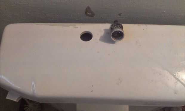 Para el primer orificio, utilice la Sierra de hoyo de 1" hacer cuidadosamente el agujero (tapa de porcelana debe ser sobre una superficie plana suave) donde sería sobre la varilla de conexión de la tubería de entrada de agua en el flotador. Tómese su tiempo para que la broca haga el trabajo y mucha agua del aerosol en la porcelana, para enfriar la broca. La tapa de porcelana puede tener dos capas para perforar a través. Este agujero es para el agua procedente del embalse.