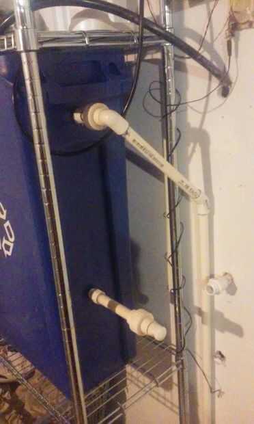 Un tubo de desbordamiento fue unido al depósito a una altura justo antes de que el embalse tendría demasiado pesado para el estante. Un agujero de 3/4 fue perforado en el depósito y se instaló un conector roscado de PVC, usando cinta de teflón para evitar fugas. Conectores y tubos de 1/2" PVC dirigen el desbordamiento de un dren en el piso.