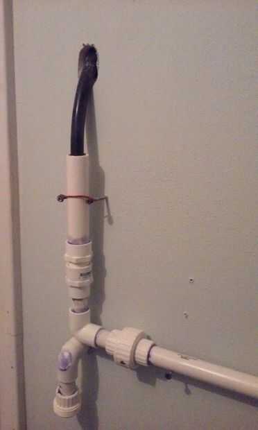 Fije el tubo a la bomba de la fuente y poner la bomba en el depósito. Enchufe la bomba para comprobar que empuja hacia fuera el agua. Como muestran mis fotos, me perforó un agujero a través de la pared del baño y poner el tubo a través de y en un tubo de PVC de 3/4" en el otro lado. La tubería fue conectada a tubería de 1/2" con adaptadores y correr por la pared del baño para terminar en un codo de 90 grados que dirige el agua en el tanque. La pipa fue apoyada en la pared con tornillos que aseguraban también que hubo una ligera pendiente hacia abajo en el tubo. Todas las piezas fueron conectadas con pegamento de PVC para evitar filtraciones. Un tornillo de liberación rápida se instaló cerca del extremo de la tubería de la bomba por lo que las piezas reciben el agua bombeada podrían ser desconectadas para solución de problemas.